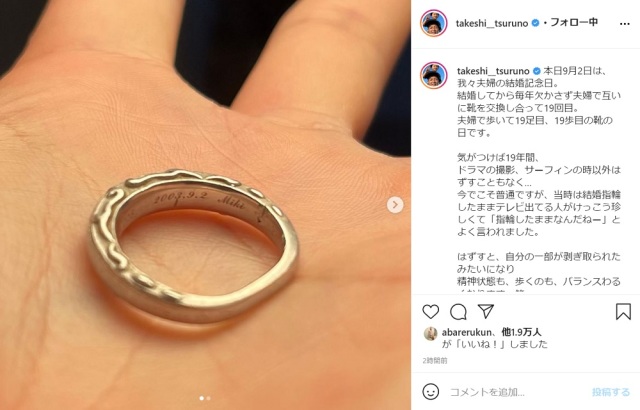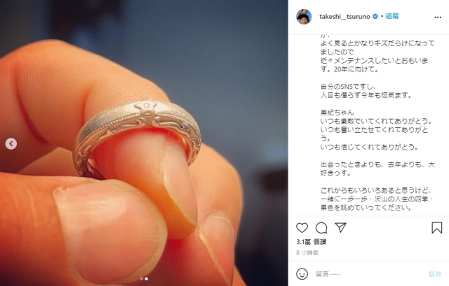 9月2日便是鶴野剛士與妻子美紀的結婚紀念日,鶴野剛士幾乎是慣例地會在社群軟體上放閃。今年他在IG上貼文寫著:「相遇的時候、去年的這個時候,我比起先前的任何時候都最愛你」。完全是閃瞎網友們的眼睛啊!