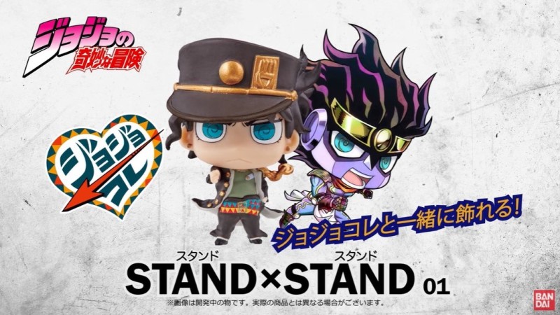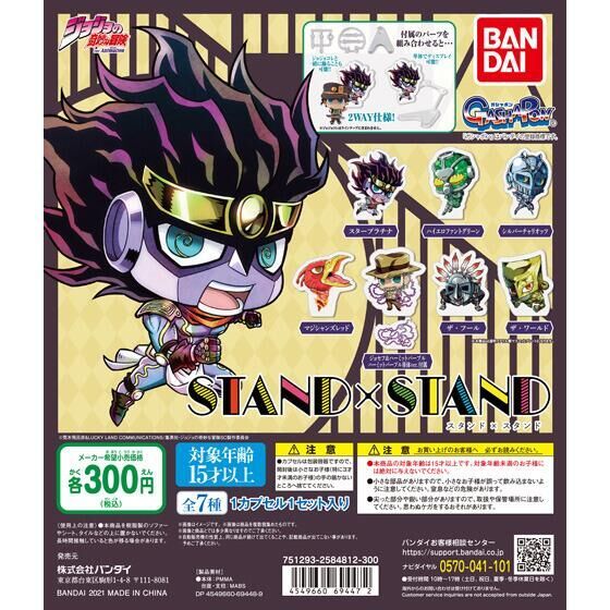 首彈「JOJO的奇妙冒險 STAND×STAND」轉蛋,收錄有七款角色:白金之星、綠色法皇、銀色戰車、魔術師之紅、喬瑟夫&紫色隱者、愚者以及DIO的世界!