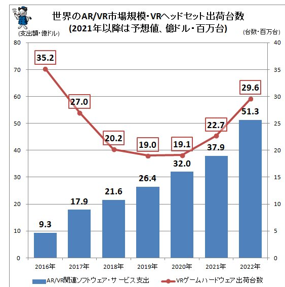 日本總務省《情報通信白皮書》於9月5日展示2021年VR、AR的走向,不只展示了2020年突破1910萬部的銷量大關,也擺脫了近年來下滑的銷售低谷,並推算未來的成長曲線有望增加。