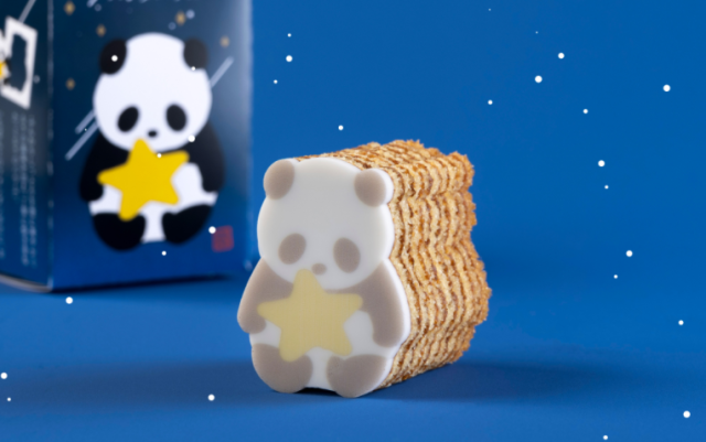 將濕潤的平烤年輪蛋糕加以特殊切割加工,便會形成擁有脫模外觀的熊貓造型美食。本次配合「東京晴空塔」加入了美麗星空的要素,特別設計抱著星星的熊貓造型。