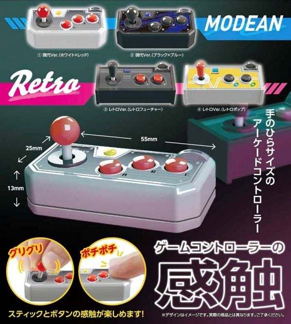 這款由TARLIN所推出的縮小版大型電玩搖桿轉蛋,總共有四種款式,分為現代版與復古版,兩個版本各有兩種造型,按鈕配置不太一樣,不過手把與按鈕可以實際動作,相當有感覺喔!喜歡格鬥遊戲的人不妨收藏起來當裝飾品。