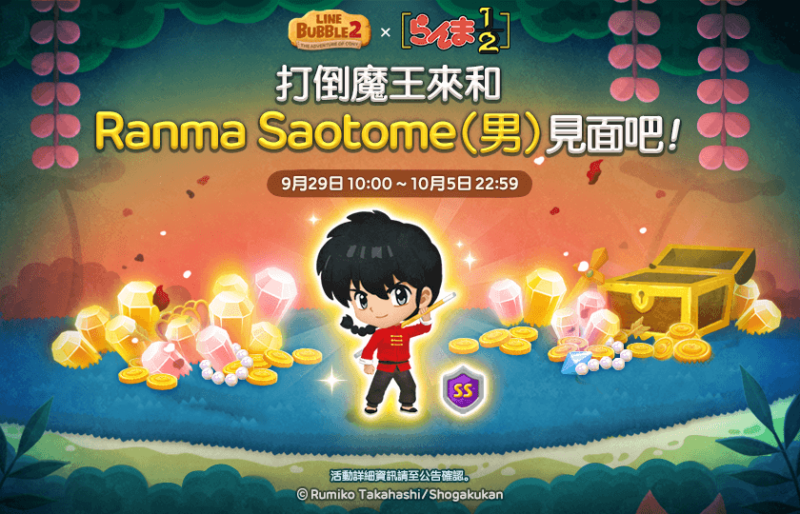 LINE GAME旗下消除泡泡益智手遊《LINE Bubble 2》,今(9)日正式公開與曾在『週刊少年 Sunday』(小學館)中連載過的超熱門漫畫『亂馬1/2 [Ranma1/2]』展開聯名合作活動!本次聯名合作中,以『亂馬1/2 [Ranma1/2]』的主角「早乙女亂馬[Ranma Saotome]」和「天道茜[Akane Tendo]」為主的熱門角色們將在遊戲內舉辦的各種活動中以合作限定寵物的方式登場,也會在高級扭蛋中出現。此外,『亂馬1/2 [Ranma1/2]』免費限定款LINE貼圖也將同步推出!喜歡《LINE Bubble 2》與『亂馬1/2 [Ranma1/2]』的粉絲們,千萬不要錯過喔。