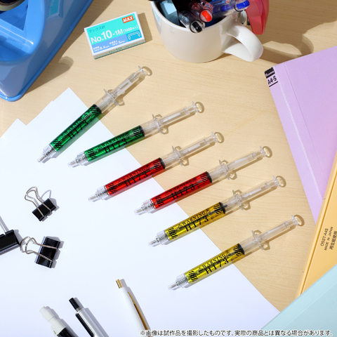 本商品是以目前放送中的7月新番動畫《暮蟬悲鳴時 卒》中,以北條沙都子偷取到的「入江機關」人員所用公事箱以及能引發「雛見澤症候群」的藥劑「H173」為印象去打造的,而說是「注射劑」,其實就是造型原子筆,有綠、紅、黃三種外殼顏色,各兩枝,六枝一組放置於公事箱內,而公事箱也還原出動畫中的金屬質感,拿在手上彷彿自己就是「入江機關」的一員。