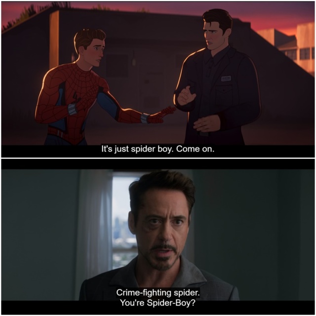 班納在危急中被黃蜂女和蜘蛛人解救,而本劇中彼得帕克的形象與湯姆霍蘭德不同,而且是由演員Hudson Thames 擔任配音。 另外,蜘蛛人的服裝也與《無限之戰》中略有不同,而是近似迪士尼樂園中的服裝,這可能是因為湯姆版本的版權歸索尼影業所有。