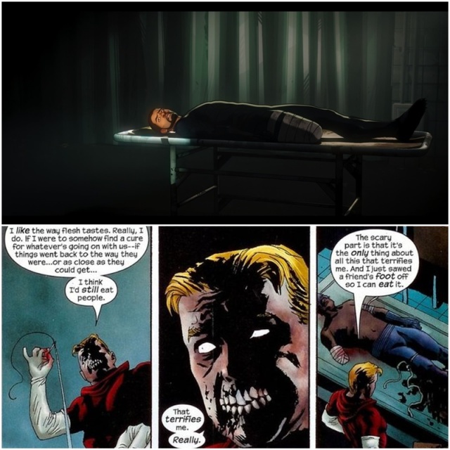 觀察者介紹了這個宇宙的喪屍病毒來自於量子領域。不過在原漫畫中則是因為不同宇宙互相影響。而動畫還原了漫畫其中一個設定,也就是人們在被感染後依然保有原來的思考能力,因此超級英雄變身喪屍後,還是懂得運用原本的能力。