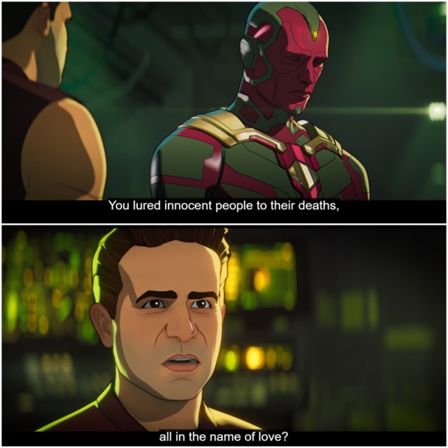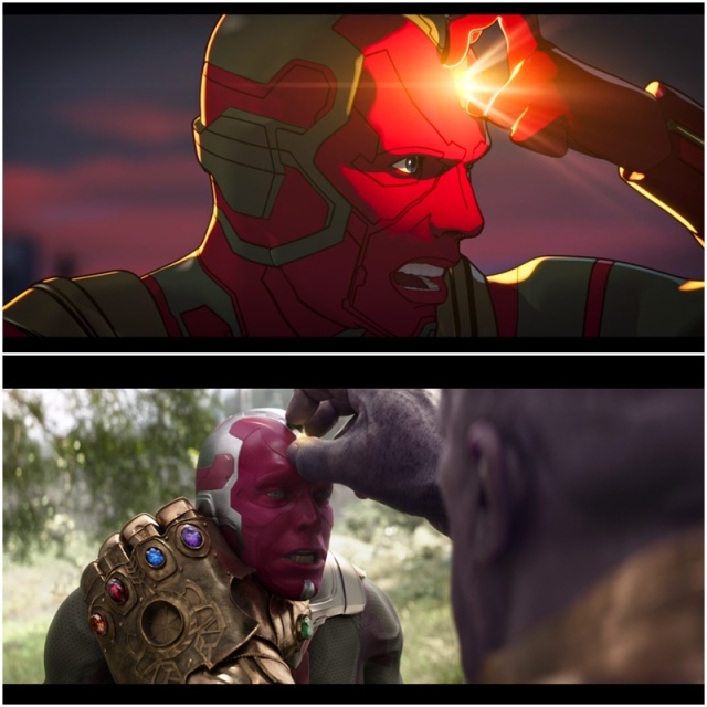 幻視坦言自己不忍心殺死摯愛,所以只能吸引活人來餵養殭屍汪達。班納質疑他怎麼能為了愛而犧牲無辜的人。這個情況就是《汪達與幻視》裡,汪達為了救回幻視,所以綁架西景鎮居民充當她愛情喜劇裡演員的翻版。
