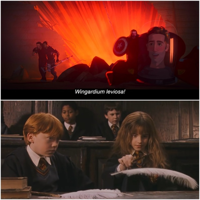 史考特乘著浮空斗篷與眾人逃離,此時他說了一句:「Wingardium Leviosa」而熟悉《哈利波特》系列作品的朋友都知道,這句話就是魔法世界中的漂浮咒語。