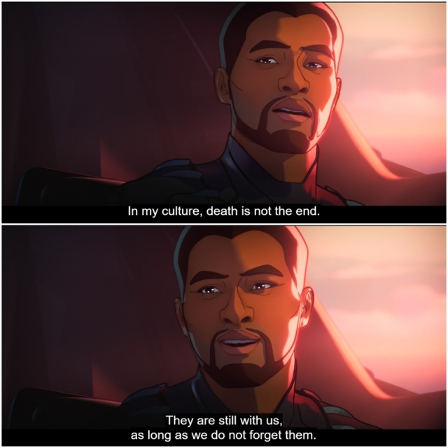 由於喪失病毒犧牲了大量的盟友,帝查拉在戰機上安慰眾人說:「在我的文化裏,死亡不是終點,只要我們還記得祂們,祂們就永遠在我們身邊。」這句話引述自《英雄內戰》中他對娜塔莎說的台詞,如今再度聽見查德維鮑斯曼說出這句台詞,格外感傷。