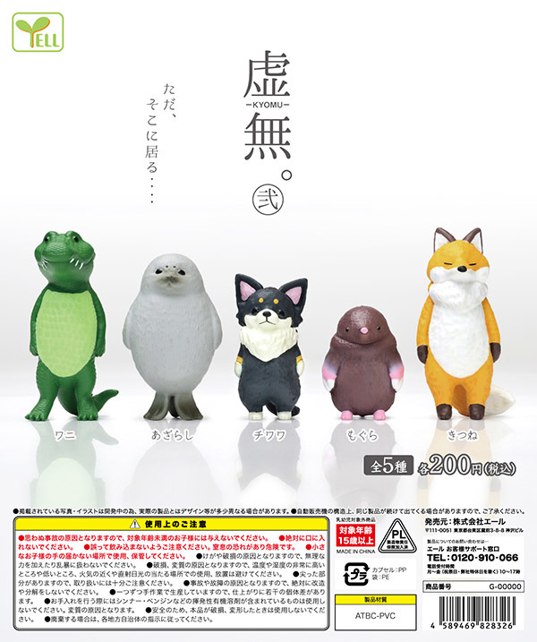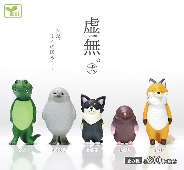 將可愛的動物以放空、癡呆放空表情呈現的 YELL「虛無」動物系列轉蛋,在首彈的空虛動物後,這次再推出五款呆呆站著的:鱷魚(ワニ)、海豹(あざらし)、吉娃娃(チワワ)、鼴鼠(もぐら)、狐狸(きつね),無神的雙眼和木訥立正的姿勢,雖然造型簡單但搭配小道具或生活場景,就能展現出無助的空虛感...