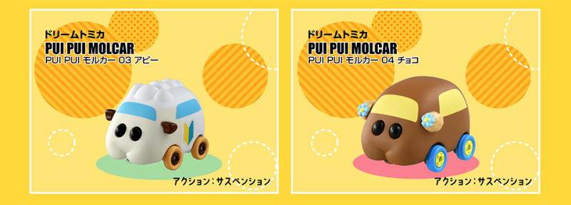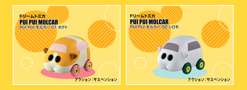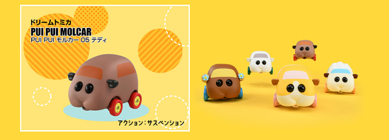 由日本 TAKARA TOMY 玩具公司所推出的合金小汽車『TOMICA』系列宣佈與大人氣羊毛氈定格動畫『PUI PUI 天竺鼠車車』合作,於 2021 年 11 月推出全五種類的「Dream TOMICA PUI PUI 天竺鼠車車」,參考售價各 770 日圓。