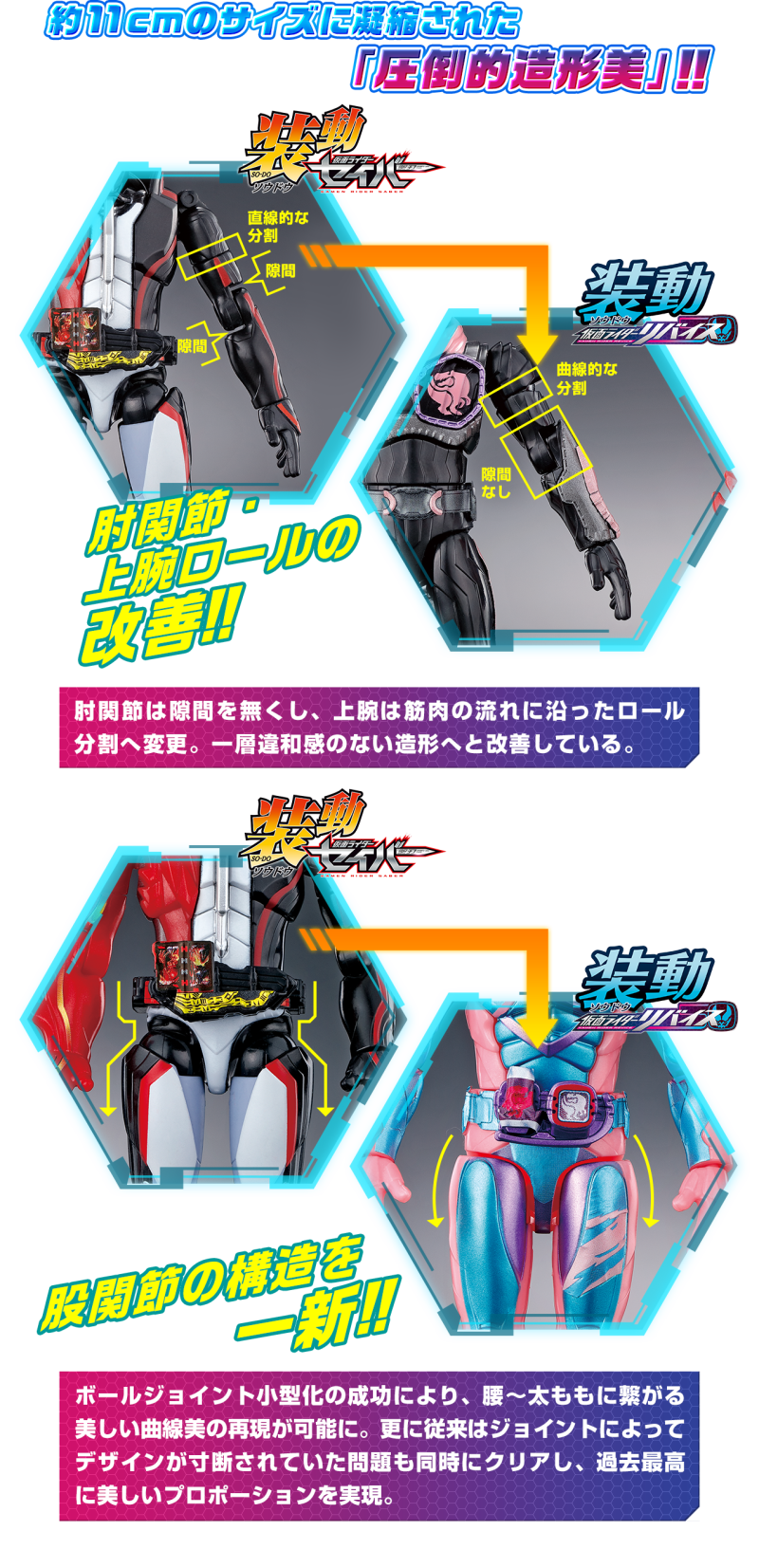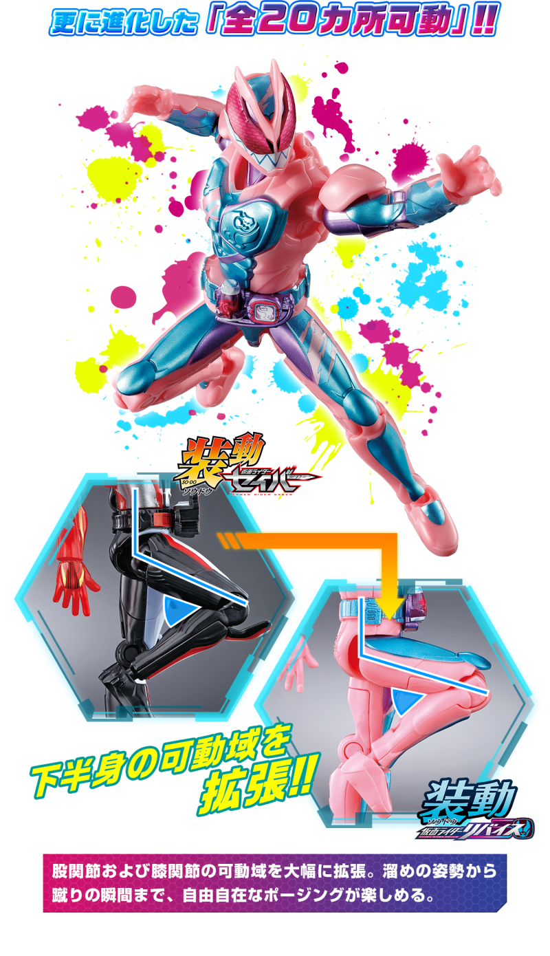 「裝動 假面騎士REVICE by1」,整體規格再進化,全身具備 20 處可動關節,導入更加靈活、活動範圍擴大的髖關節,肩部拉出關節擴張,手肘與上腕也作了分割改善,讓整體的線條更加流暢俐落;頂級品質的精美塗裝,更精緻展現完美細節!角色陣容收錄《假面騎士REVICE》一分為二的「假面騎士REVI 」、「假面騎士VICE」,與過去系列相同採用 A+B 形式,蒐集到相同的假面騎士 A、B 組零件即可組合出完整的假面騎士與武裝。