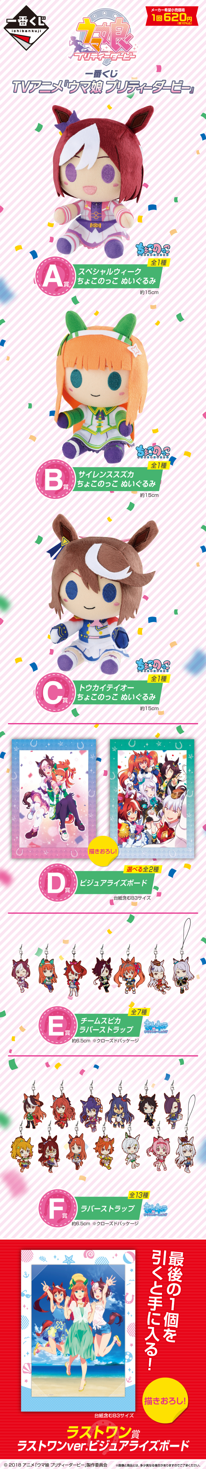 『一番賞 賽馬娘 Pretty Derby』獎項中包含超可愛的特別週、無聲鈴鹿、東海帝王 CHOKONOKKO 15公分布偶、印有動畫視覺圖的插畫版、全 20 種的馬娘橡膠吊飾等豐富內容!