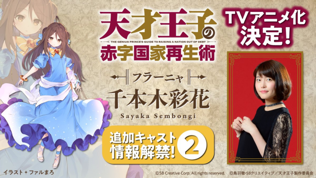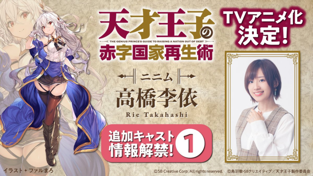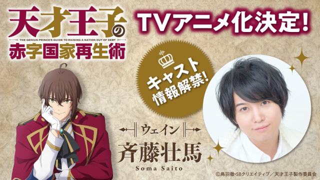 由鳥羽徹創作,插畫由ファルまろ負責的輕小說作品《天才王子的赤字國家重生術》(天才王子の赤字国家再生術〜そうだ、売国しよう〜),在今年 1 月底宣布了電視動畫化的消息。於近日也公開了首部宣傳影片與聲優情報,預計將於 2022 年 1 月開播。