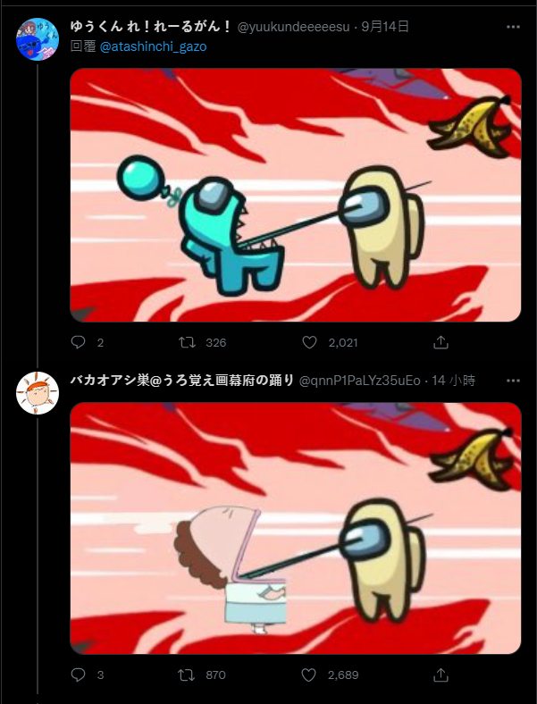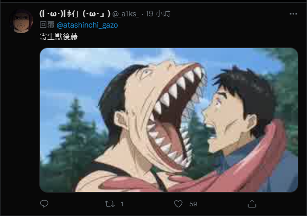 而也因這一幅圖,讓網友們直接聯想到這一陣子相當火紅的多人生存遊戲《Among Us》,嘴巴張開刺殺對方的樣子;又或者是在另一部動畫《寄生獸》中,寄生生物準備將人給吞食的時候,也十分像花媽張大嘴巴的模樣;更甚至有其他網友是直接聯想到了鯨魚,或是其他怪獸物種,反正不論怎麼樣,這個動作絕對不是正常人類能夠做到的XD