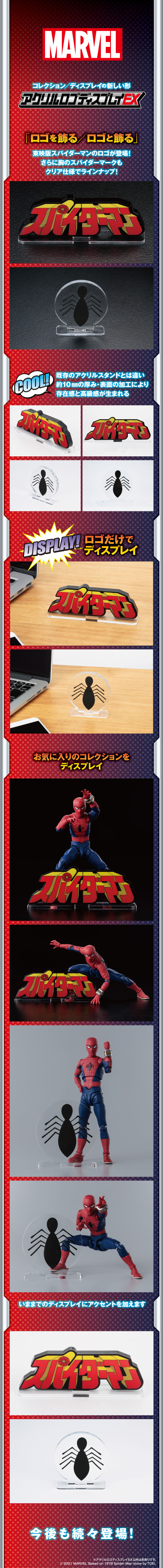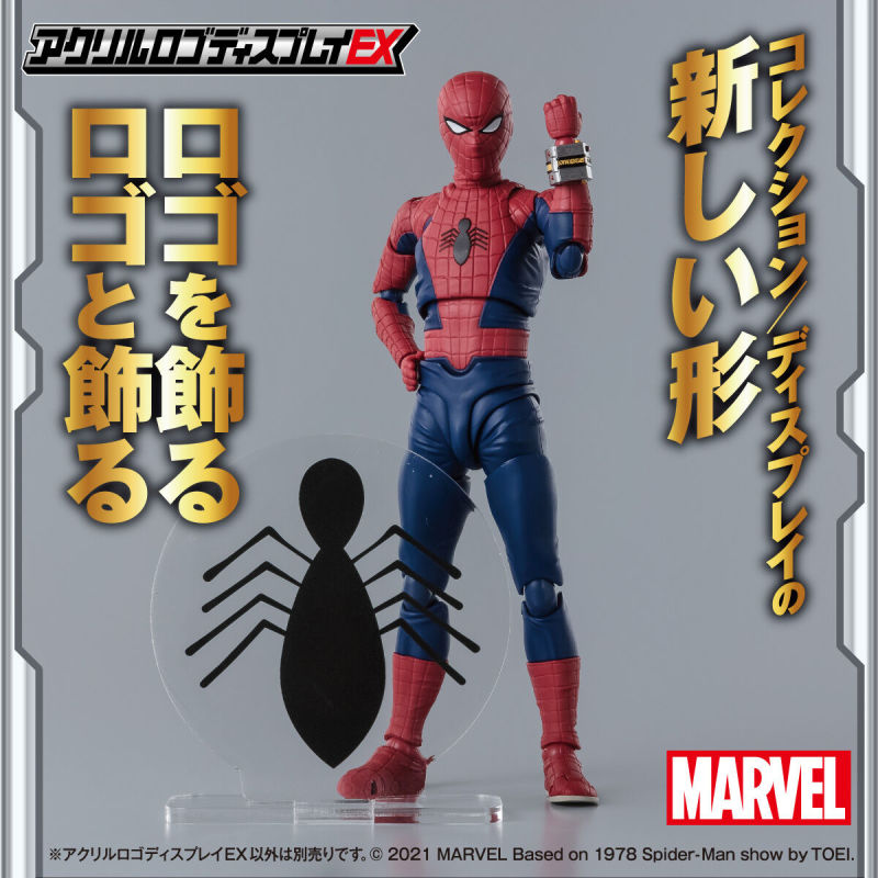由日本萬代公司旗下專門推出角色主題服飾、生活週邊的「BANDAI FASHION COLLECTION(バンコレ!)」發行,能夠獨立展示、跟玩具更是相輔相成的擺飾商品系列「壓克力LOGO展示牌EX」,將在 2021 年 11 月推出 MARVEL 東映蜘蛛人主題的兩款新作「東映蜘蛛人」(スパイダーマン 東映TVシリーズ)與「英雄標誌」(ヒーローマーク)!