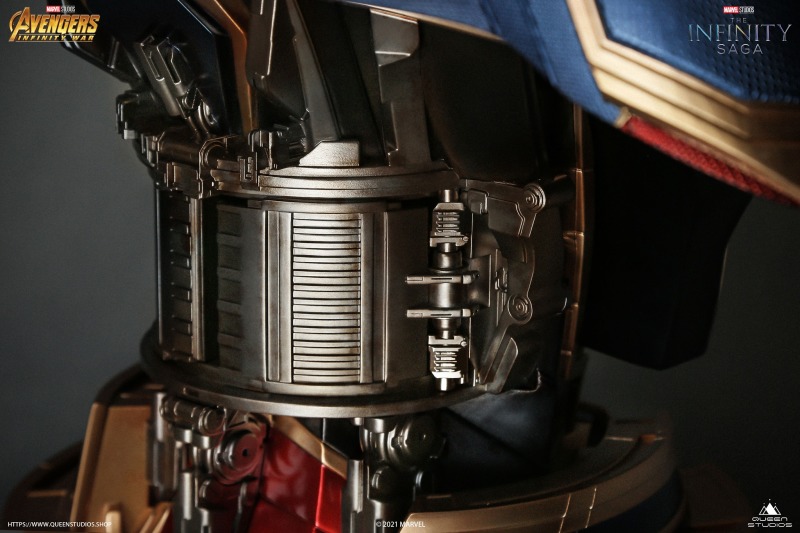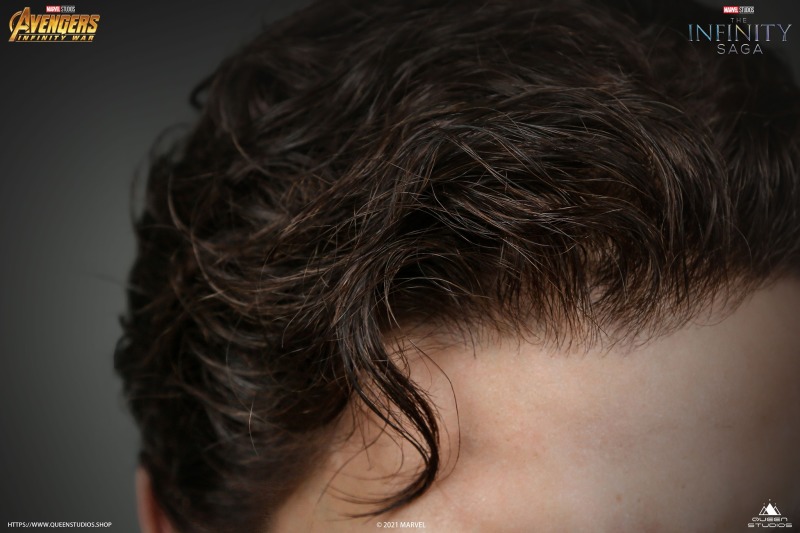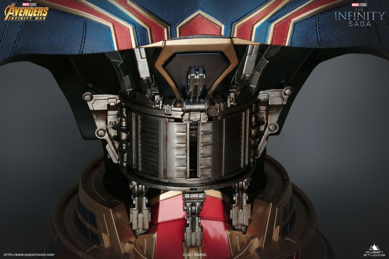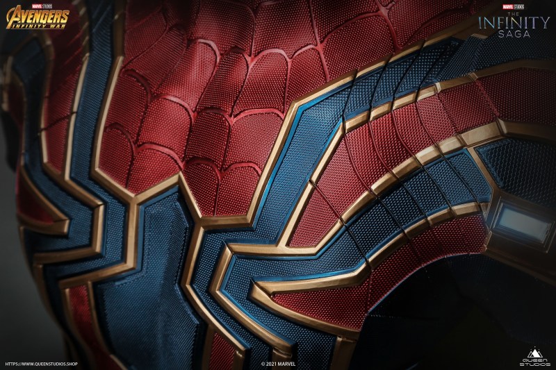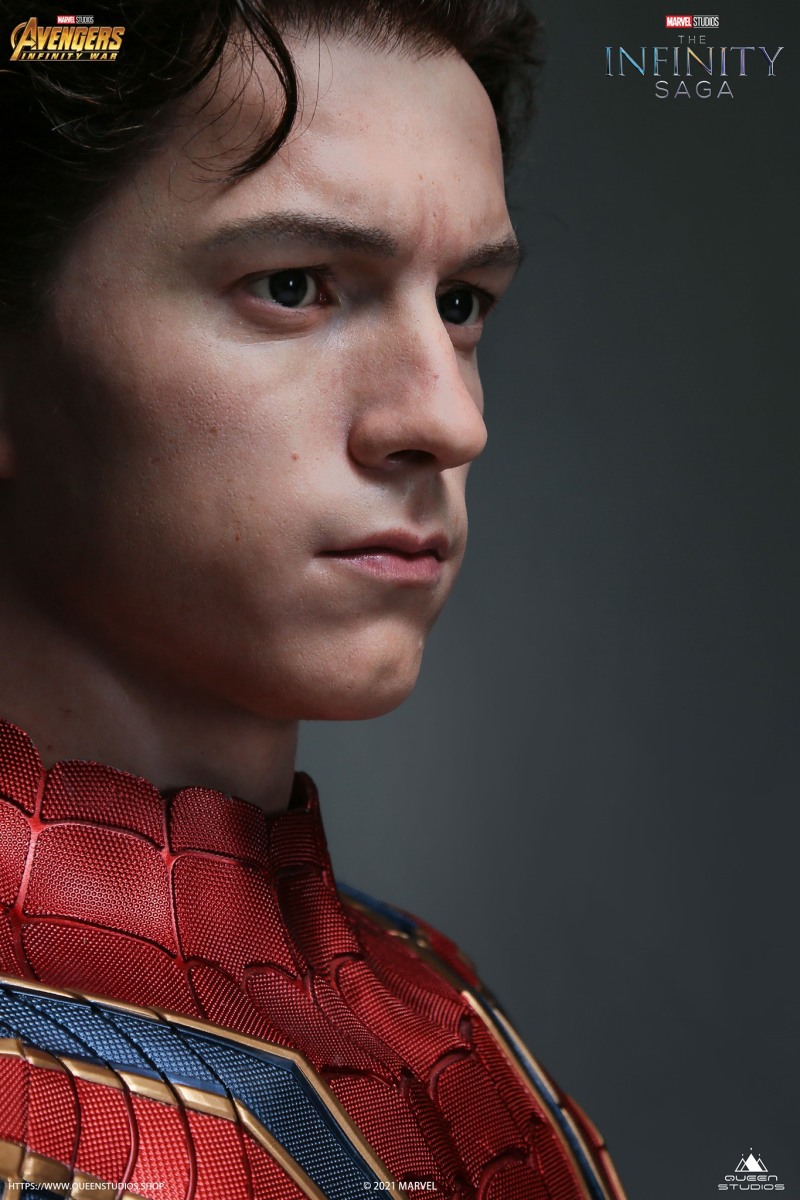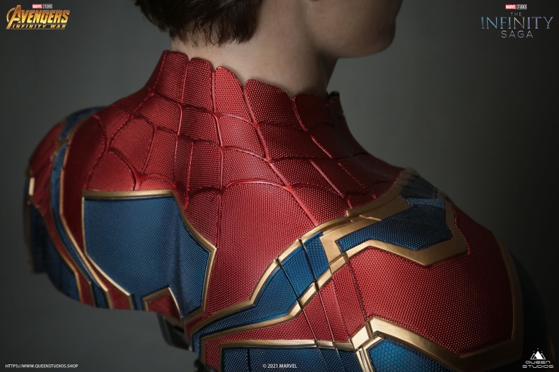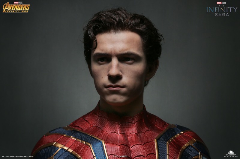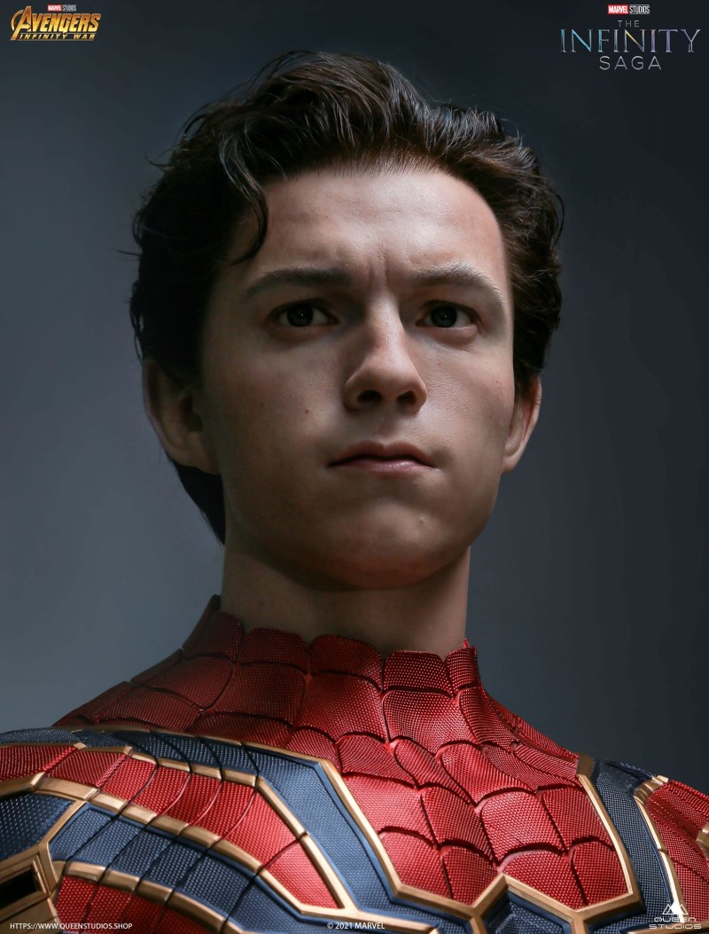 本次 Queen Studios 推出的「鋼鐵蜘蛛人」1:1 真實比例半身胸像,以《復仇者聯盟:無限之戰》登場的鋼鐵蜘蛛裝造型為設計,尺寸全高達 72 公分,拿下鋼鐵蜘蛛面罩,頭雕採用頂級矽膠製作,植入超擬真玻璃眼珠,徹底還原飾演小蜘蛛的湯姆·霍蘭德(Tom Holland)神韻,並栩栩如生打造毛孔膚質與臉部細紋,以及雀斑塗裝等;高製作水準的植髮技術,將羊毛製髮絲根根植入矽膠頭皮中再加以修剪,整體表現相當令人驚豔!
