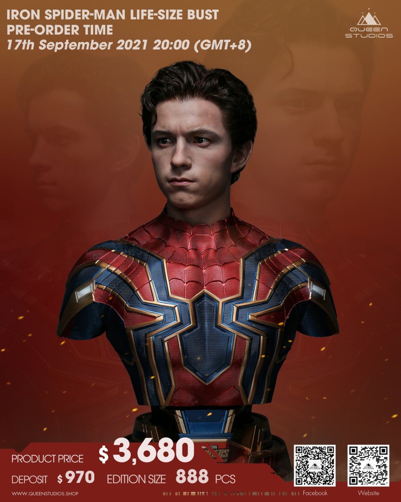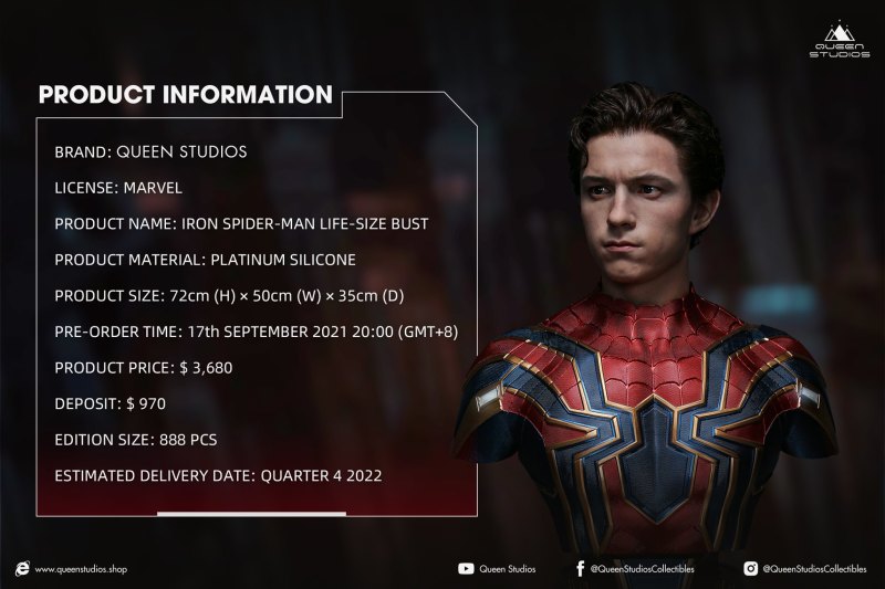 擅長以大比例雕像表現角色魅力、重現逼真細節的造型廠牌 Queen Studios ,將以 MARVEL 漫威宇宙電影《復仇者聯盟:無限之戰》為主題,推出「鋼鐵蜘蛛人」1:1 真實比例半身胸像新作!參考售價為 $3,680 美元,全球限量 888 體,預計將於 2022 年第四季發售。