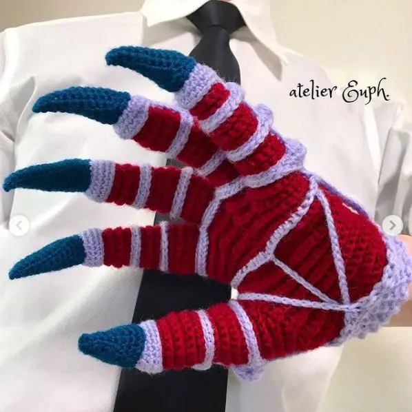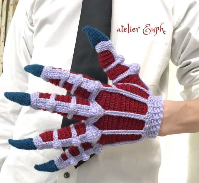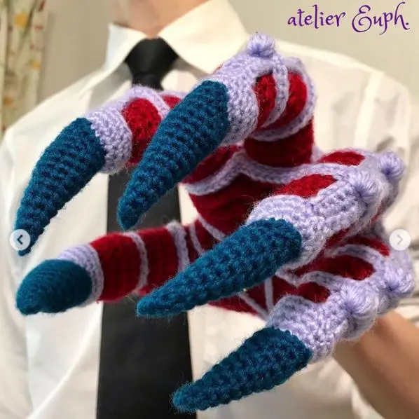 擅長編織工藝的ユーフォ,有考慮編織相關的認證技能許可,不時會在個人推特上放上自己的作品。而這個《靈異教師神眉》鬼手手套是他的得意之作。他也是在意外中發現了鬼手的造型在編織上十分具有挑戰性,具有多色色塊與線條的設計,讓他進行這項任務。