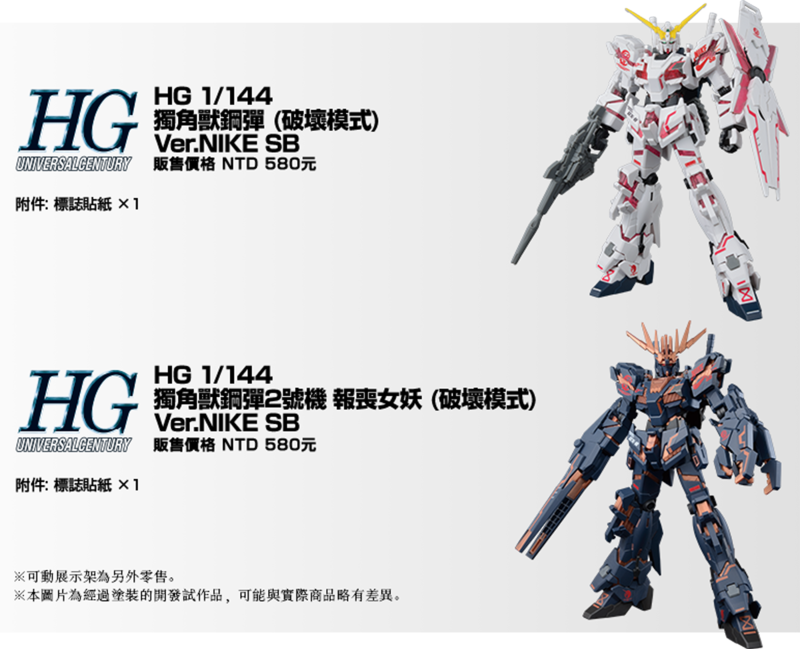 為慶祝於 2007 年推出的《機動戰士鋼彈UC》小説 15 週年, NIKE 旗下滑板品牌 NIKE SB 與萬代 BANDAI SPIRITS 攜手展開合作企劃,釋出穿著潮鞋的神物「QMSV RX-0 獨角獸鋼彈 Ver.NIKE 」兩款限定聯名商品後,今(17)日再度發佈了將推出「HG 1/144 獨角獸鋼彈 (破壞模式)Ver. NIKE SB」、鋼彈模型的消息,並預計在 THE GUNDAM BASE TAIWAN 鋼彈旗艦店、以及 萬代台灣PB官方網路商店限定發售!