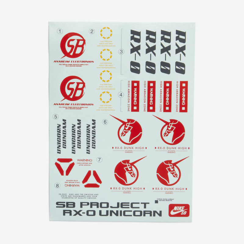 重量級的跨界合作NIKE SB×《機動戰士鋼彈UC》預計將推出 RX-0 獨角獸鋼彈、RX-0 獨角獸鋼彈二號機 報喪女妖配色兩款限定鞋款,首先在台灣正式發售的「SB Dunk 高筒鞋 Gundam Project Unicorn White」,將 DIY 創意和科幻時尚帶進玩趣風格的 SB Dunk 系列,在鞋款中融入獨角獸鋼彈代表性的特色紅、黃配色;細節方面更是把頭上特色的V字角注入 NIKE 標誌性的勾勾 LOGO,透過可拆式魔鬼氈 Swoosh 設計,能大幅改變出簡潔/高調的不同造型!另外還有獨角獸鋼彈LOGO、機體編號等聯名貼紙,鞋尖、縫線及內裏豐富的細節大大滿足鞋迷與鋼彈收藏家!