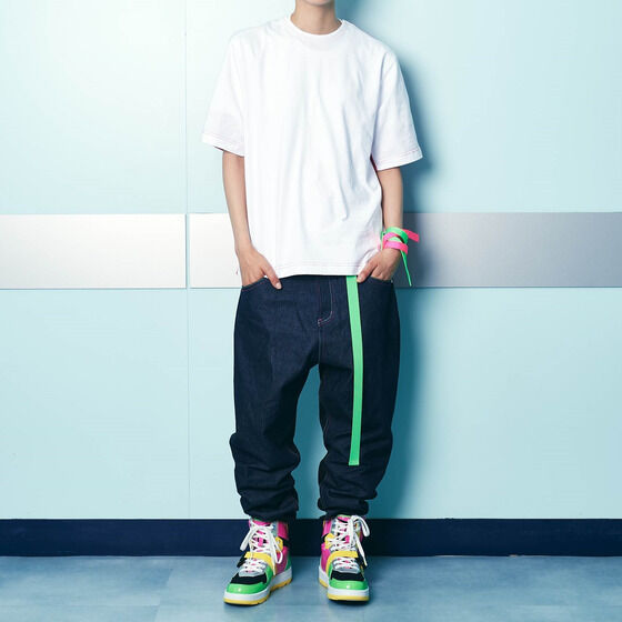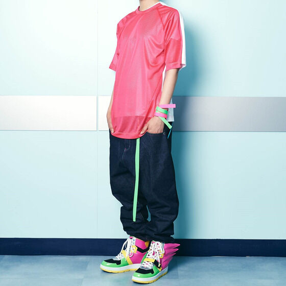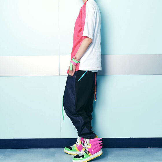 這次以《假面騎士EX-AID》為主題的服飾系列商品,主要以假面騎士EX-AID的多色設計來製作,推出的包含球鞋、大衣外套與短T 都是以多色拼接為主軸,日常生活上要穿搭雖然比較困難,但也的確反映 EX-AID 的特色。