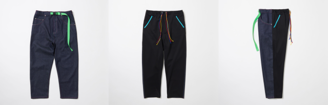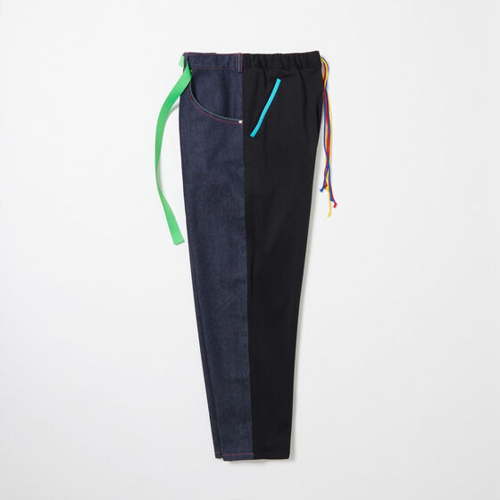 以牛仔布面 ( 前 ) 與黑色帆布 ( 後 ) 作拼接結合,打造一款兩邊都可以穿著的趣味褲款,輔以配件與拉鍊等處亮眼的顏色配置,讓本款拼接褲款在顏色上更加吸引目光。售價為 22,000 日圓。