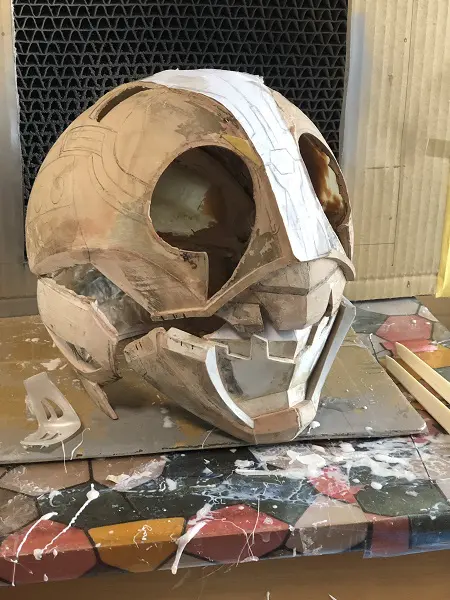 推主使用玻璃纖維強化塑膠(FRP, Fiber-reinforced plastic) 來製作頭盔本體,是以玻璃纖維及樹脂所結合之複合材料,玻璃纖維扮演補強材,而基礎材料為樹脂,如同鋼筋加混凝土,常用於航空、汽車、船舶和建築等工業領域。推主製作的概念,希望可以真的佩戴在頭上外,還要可以像機車安全帽一樣打開和關閉。