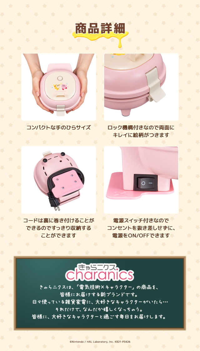 日本萬代 Bandai 旗下株式會社 CCP 的品牌 charanics 近日宣布將推出任天堂經典遊戲 IP《星之卡比》的商品,為實用又可愛的造型鬆餅機,可以製作出可愛的卡比鬆餅唷!售價為 3,800 日圓,目前可以在日本萬代 PB 網站訂購。