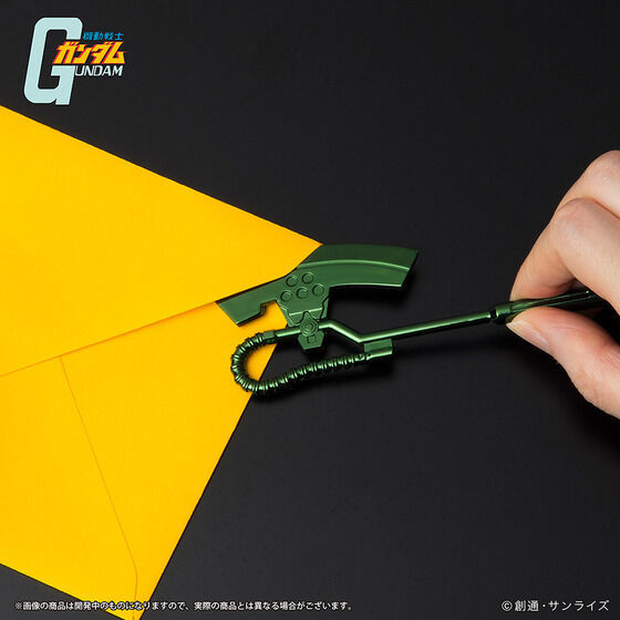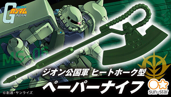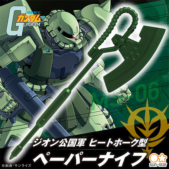 日本萬代南夢宮集團旗下的 SUN-STAR 文具公司(サンスター文具株式会社),在以《機動戰士鋼彈》為主題推出受到好評的電熱斧型、夏亞專用電熱斧型拆信刀之後,這次換上吉翁軍的軍綠色塗裝,再度推出「吉翁公國軍拆信刀」(ジオン公国軍ヒートホーク型ペーパーナイフ),讓粉絲們拆信也能充滿吉翁公國榮光!