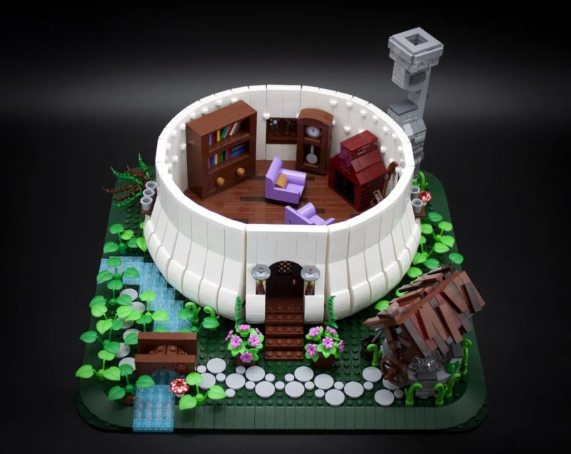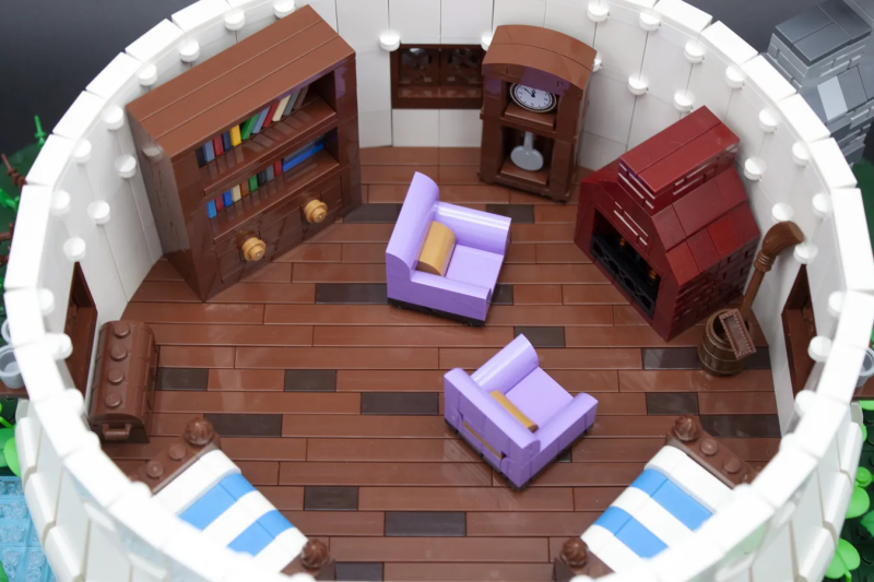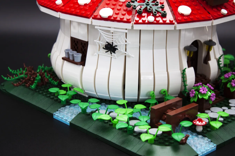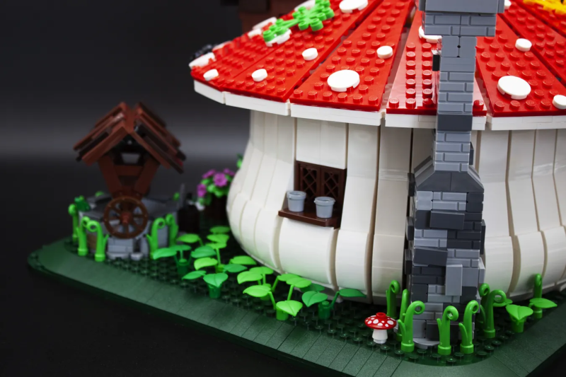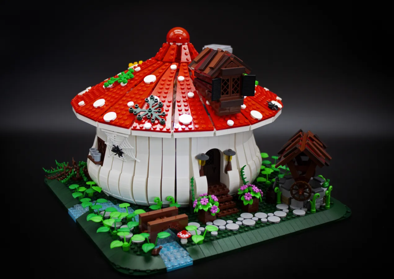 這次的「蘑菇屋」靈感是來自於作者 JohnyKov 在夏季最喜歡的休閒活動-採蘑菇,他利用 2500 片零件打造出在幻想故事中才會出現的蘑菇屋,尺寸部分是 37×37×24(長×寬×高)公分,蘑菇屋圓潤的線條、弧形的牆壁,以及菌傘形狀的屋頂,都在保有滿滿童話感造型的前提下注入了大門、煙囪、窗戶這些實際房屋該有的元素,屋頂也可以輕易地掀開,享受裡頭的書櫃、老爺鐘、壁爐......等復古風味的內裝。