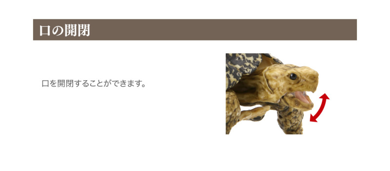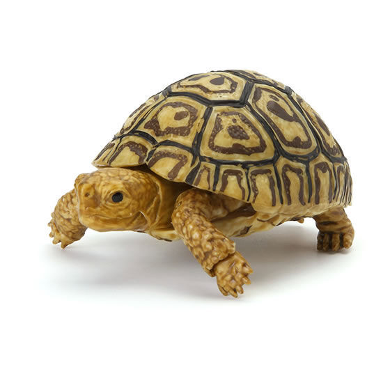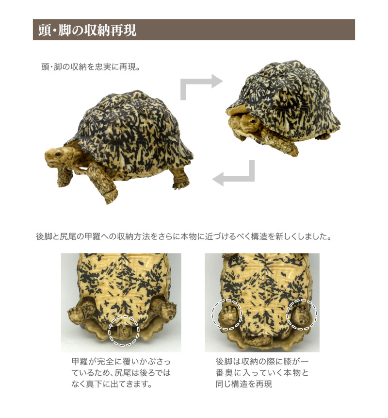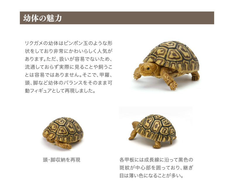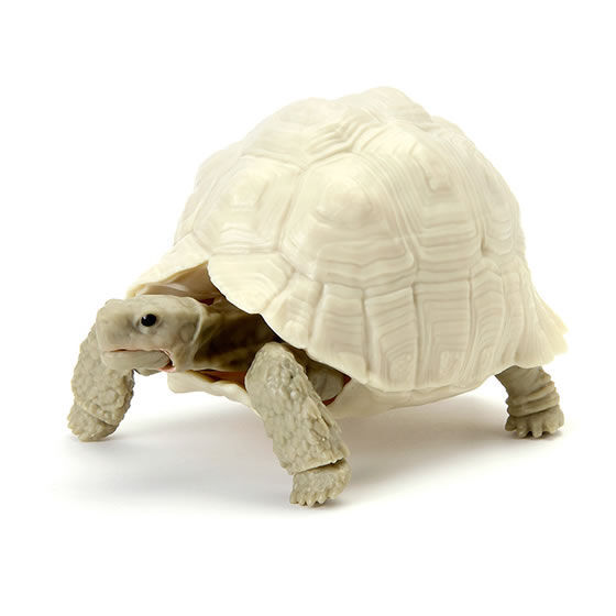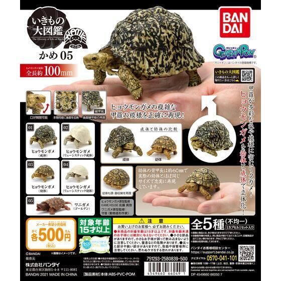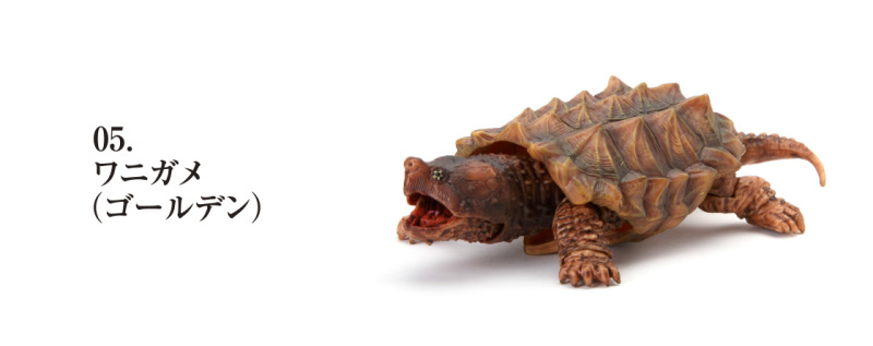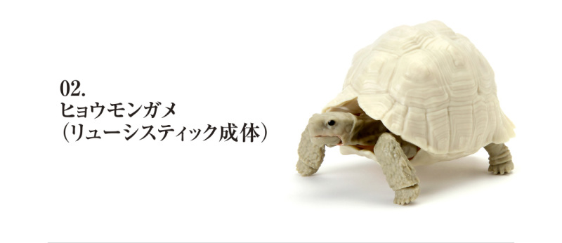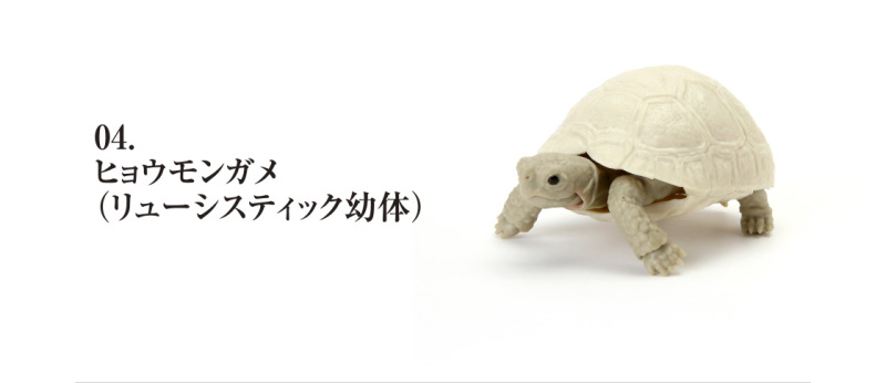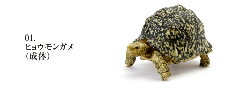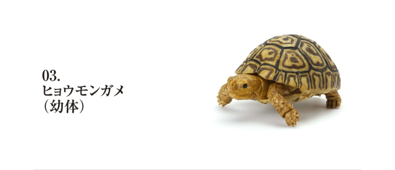 第五彈「烏龜05」轉蛋,以龜殼花紋細緻又複雜的豹紋陸龜為主角,推出豹紋陸龜(成體)、白化豹紋陸龜(成體)、豹紋陸龜(幼體)、白化豹紋陸龜(幼體),以及在本系列相當人氣的鱷龜(金色)。除了再現豹紋陸龜的背甲高、圓頂與隆背,最大亮點就是背甲的黑色斑點及獨特的斑紋!另外,幼體鱗甲上尚未散開的啡紅色圓形斑紋與嬌小體態也非常可愛又具特色~並延續系列的可動設計,手腳和尾巴都可以完整縮入殼中!