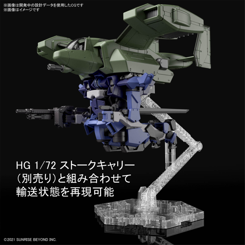 武裝部分則有專用步槍(榴彈發射器裝備)、長劍×2,頭部同樣可替換為停駐狀態造型,。此外還能搭載於另售的「HG 1/72 白鸛運輸機」下方再現運輸場景!