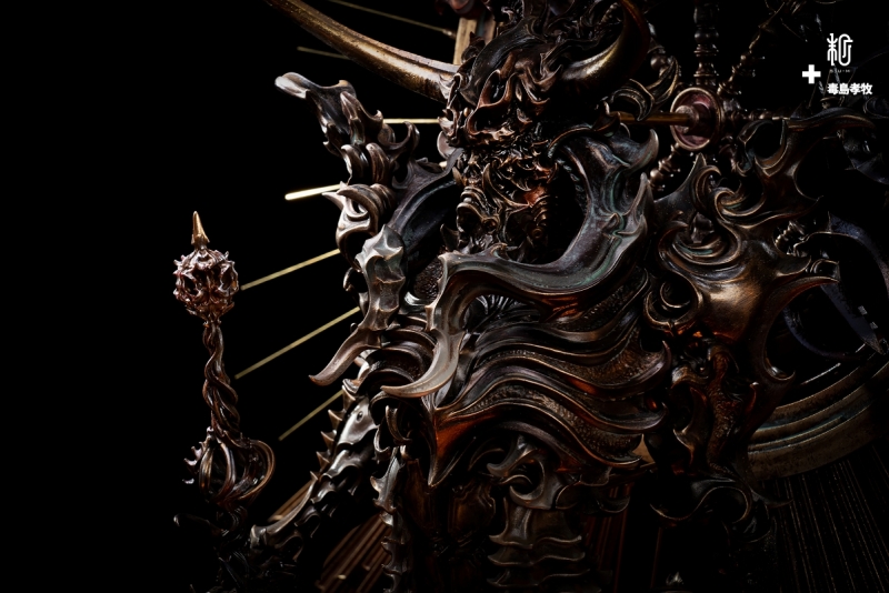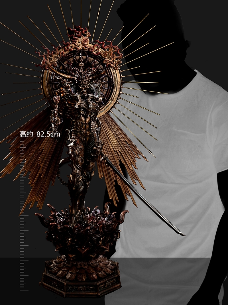 冥王 哈里・哈拉 羯諦前陣子已經推出零件數多達 97 個的 1/6、1/4 比例 GK 套件,這次更要以 1/4 比例完成品規格推出極為豪華的「火焰冥王 哈里・哈拉 羯諦」,雕像主要採用 Polystone 製作,背部神光則是黃銅材質,大幅再現原型細膩刻畫的造型,在全高 82.5 公分的巨型尺寸下更顯莊嚴。