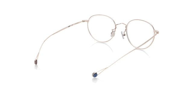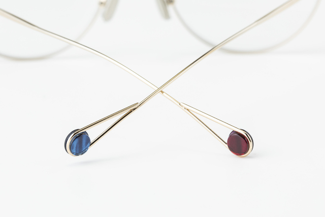 以圓形的金色鏡框為主體,鏡腳末端有著五條咒術「無下限咒術」的「蒼」與「赫」的紅藍色圖案造型,