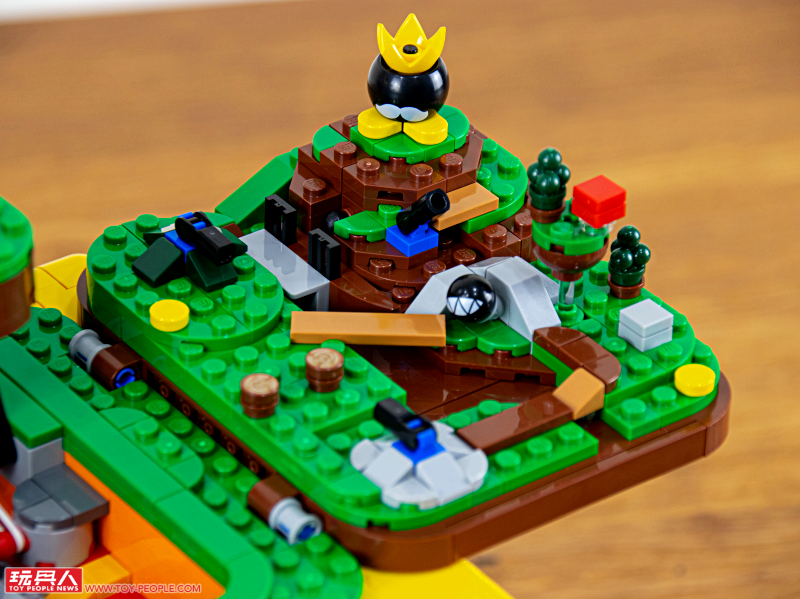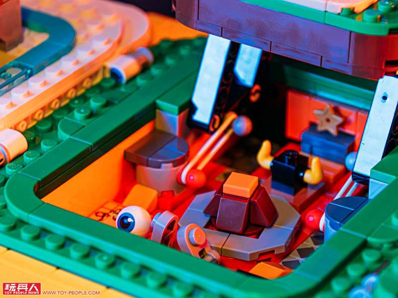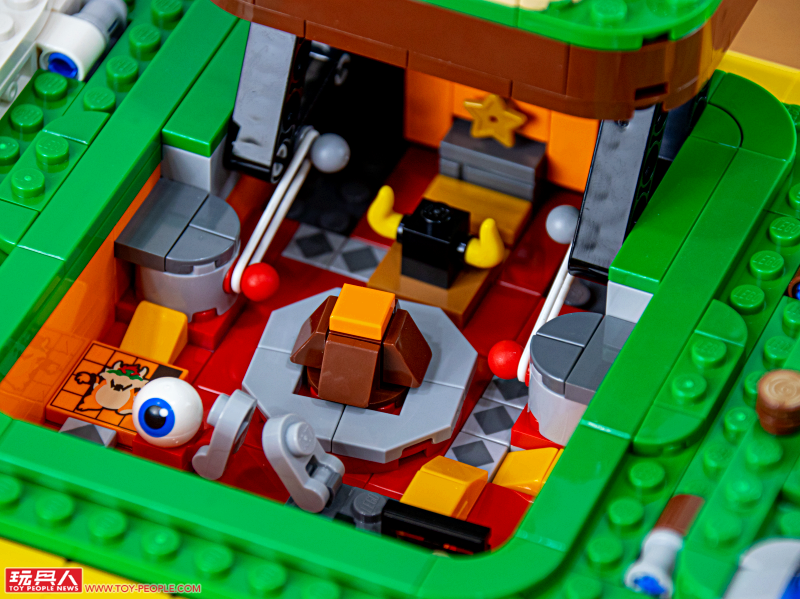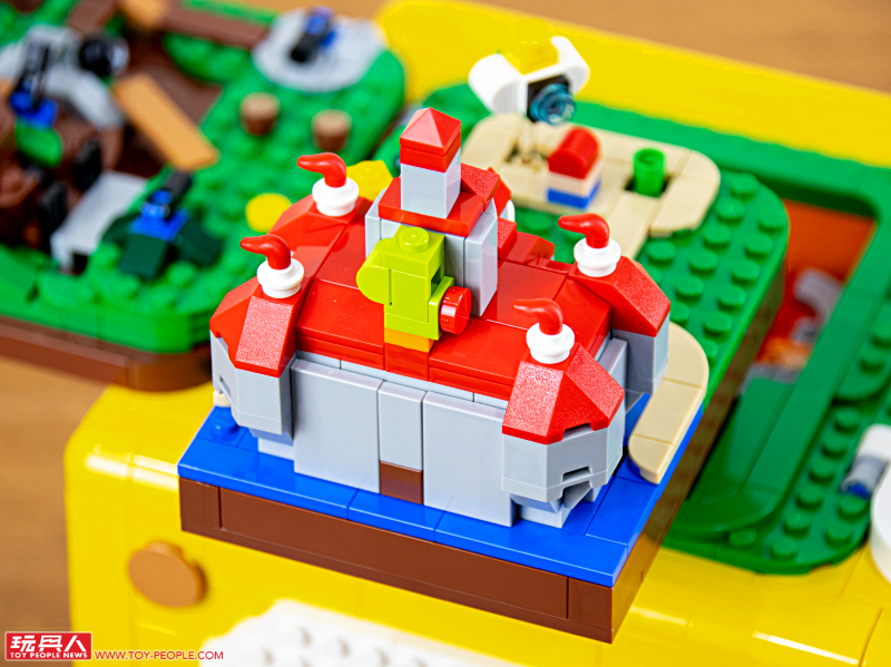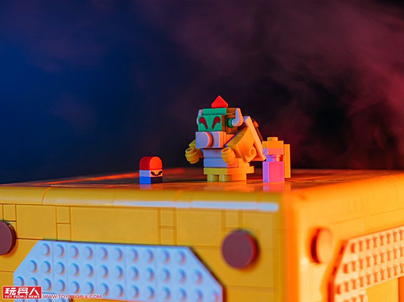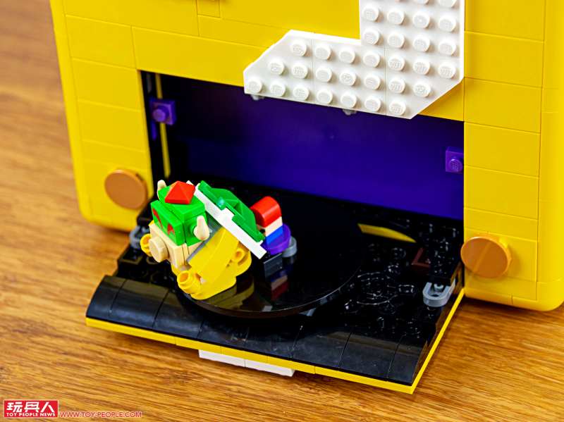 ▼ 以為除了彈出的關卡之外就沒有了嗎?在問號磚塊的正面還能掀開,大魔王「庫巴」現身!這邊還有一個機關,只要將紫色斜面磚往下一按,就會彈出一個圓形的可轉動平台,不過沒玩遊戲的玩具人可能會不明所以,這邊其實是《超級瑪利歐64》Boss 戰鬥中、瑪利歐拉著庫巴尾巴繞圈甩的場面。