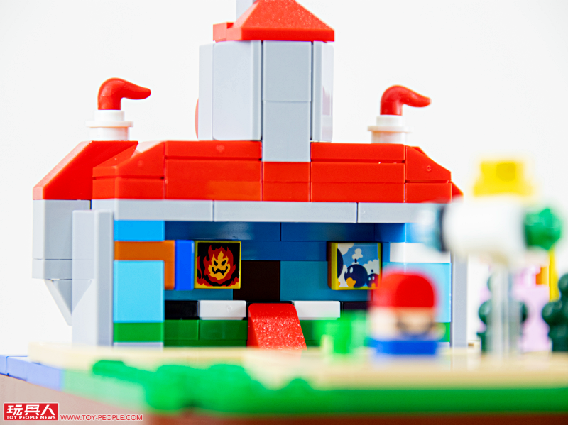 ▼ 把城堡的前半拆開之後可以看到內部牆壁上的 1×1 印刷磚,這就是在遊戲裡、玩家必須操縱瑪利歐跳進畫中才能開始闖關的環節,包含了對應其它三個場景的「炸彈兵的戰場」、「冰冰冷冷山」,以及「火焰泡泡樂園」。