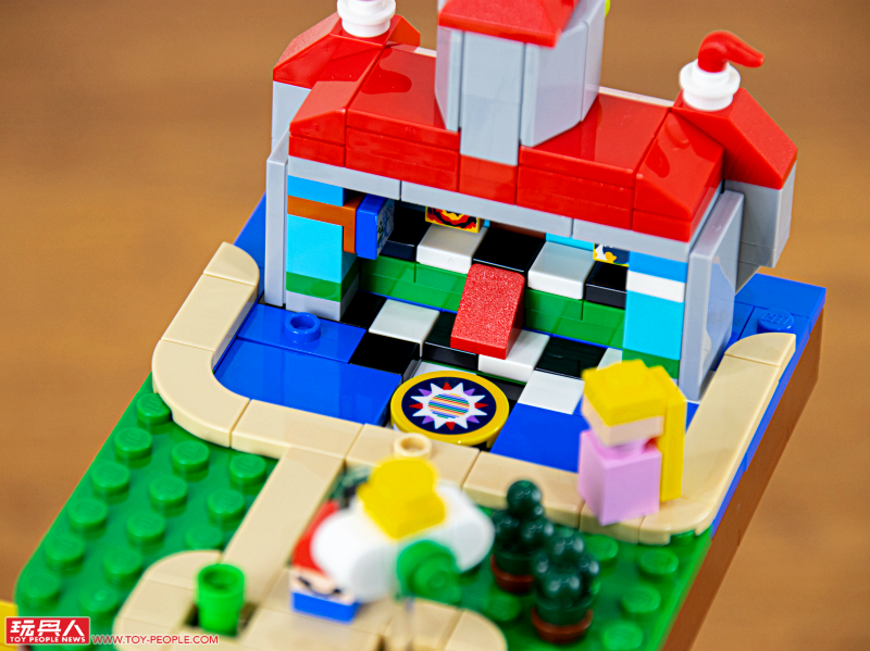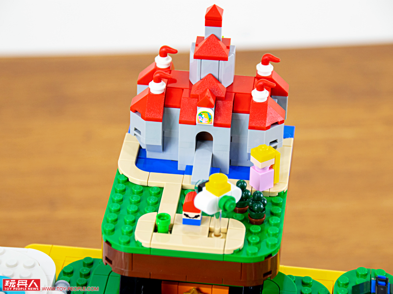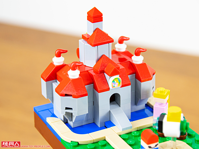 ▼ 既然《超級瑪利歐64》遊戲是從瑪利歐被邀請去碧姬公主的城堡開始,就先從城堡來!微型比例的規格中打造出結構漂亮的城堡、護城河、橋樑,以及周遭的綠地,城堡正面中央的碧姬公主彩繪玻璃這邊也以精美印刷磚表示,角色部分包含「瑪利歐」、「碧姬」、「球蓋姆」,跟藏在城堡後面的「耀西」。