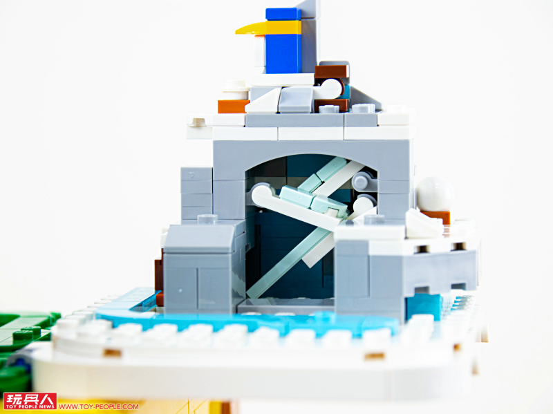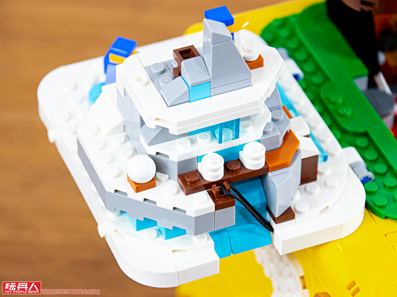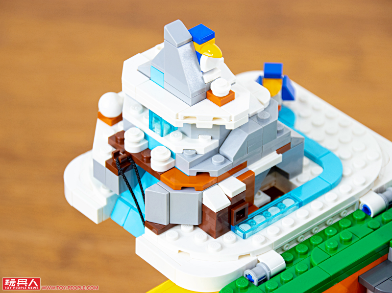 接下來是雪白關卡-冰冰冷冷山,再現了纜繩、滑冰賽道......等元素,角色部分是磚拼形式的企鵝與迷你小企鵝。