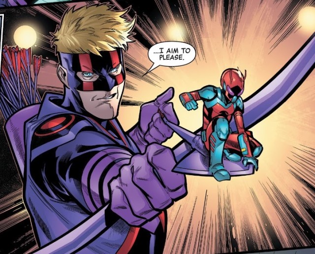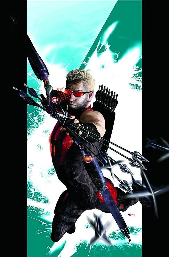 這個宇宙的鷹眼還保持著較為古早的造型。裝備上,由於美國隊長在意識到自己即將變成食人魔時要求制裁者幫他解脫,鷹眼從此也攜帶著美國隊長的盾牌。