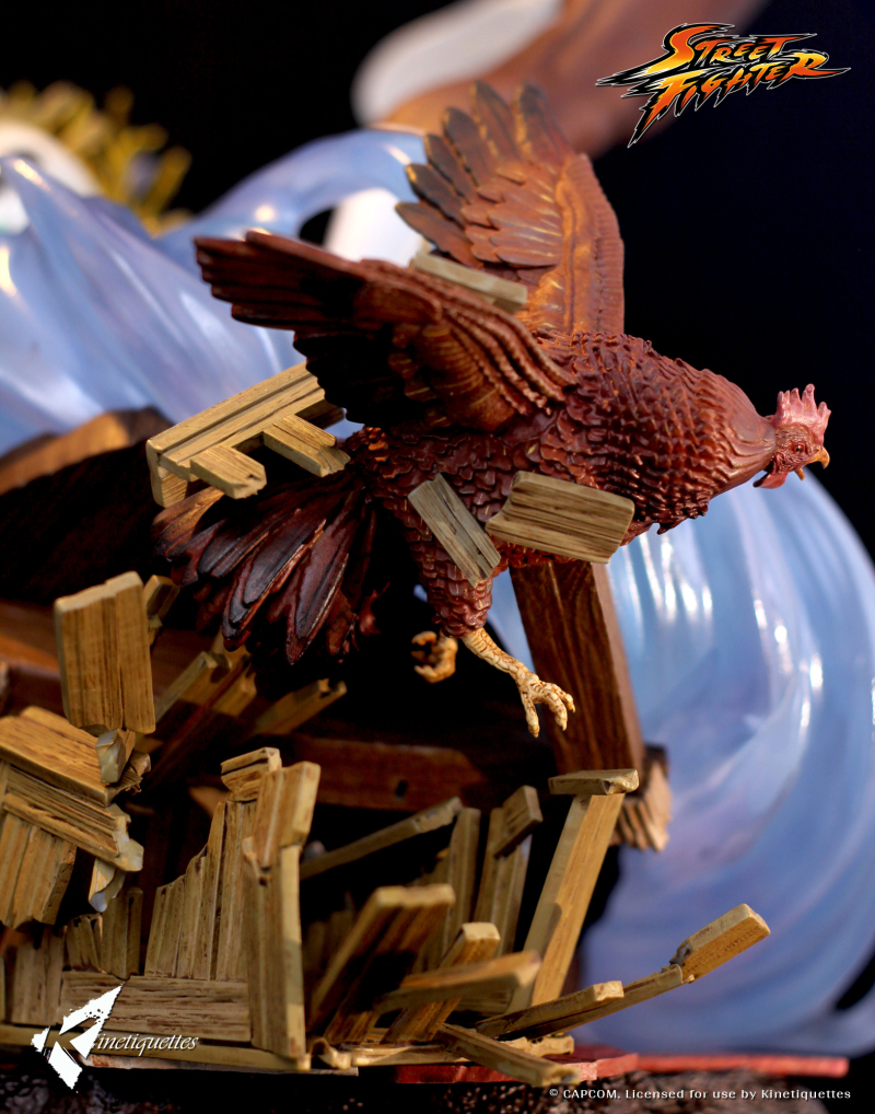 以麵食小館為題製作的場景底座除了做出施展招式的藍色特效之外,還有被踢破的桌椅、翻倒的湯麵、逃跑的公雞這些超生動元素;另外,購買這次的春麗 Female Fighter 雕像還可以獲得 A3 大小的 Artgerm 畫作(Art Print)喔。