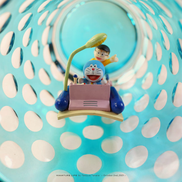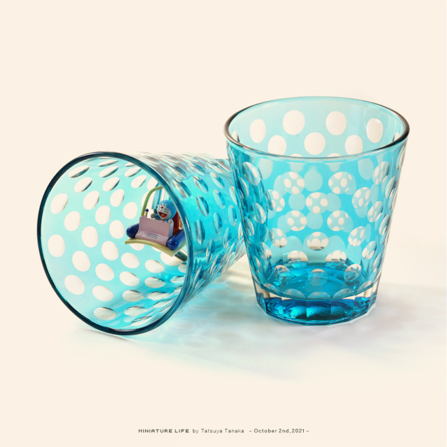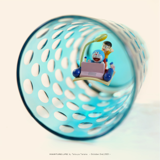其中日本著名微型創作達人「田中達也」,又再一次於Twitter上分享了相當有趣的創作,從圖片中可以看到搭乘著時光機的哆啦A夢與大雄的微型玩具,被裝在一個十分漂亮的藍色玻璃杯中。