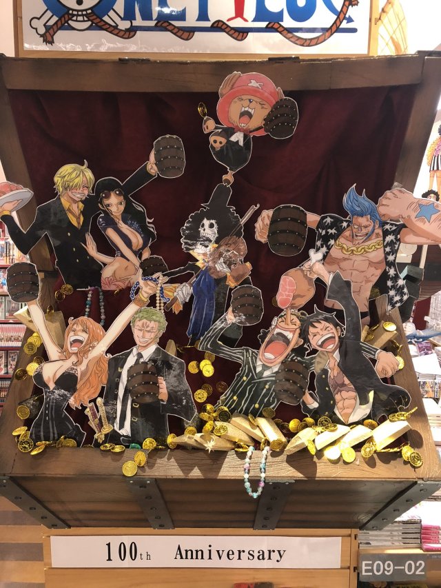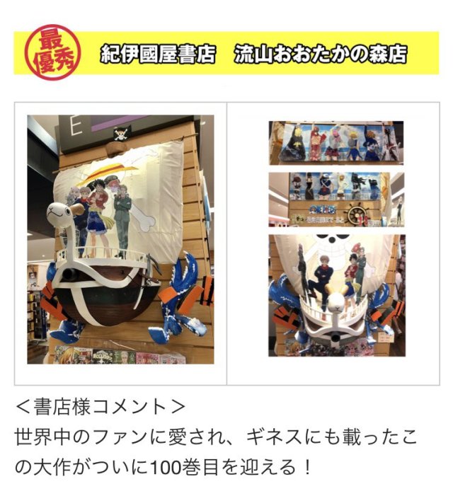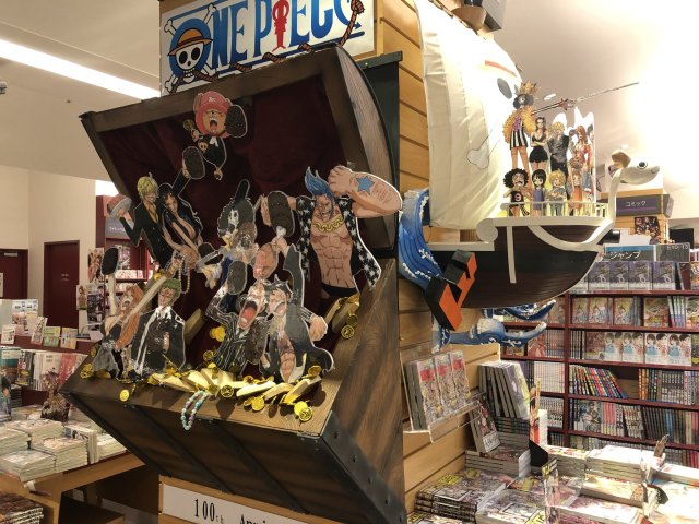 而近日最熱門的話題之一,無非就是國民漫畫《ONE PIECE》單行本滿100冊的紀念活動,除了配合觀光產業所設立的貨櫃藝術裝置外,對於漫畫店、書店方面同樣也是因應熱潮來打造主題佈置。