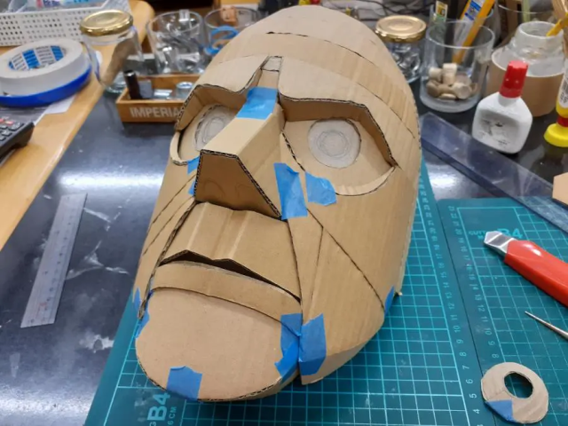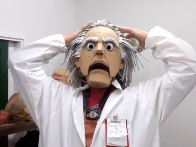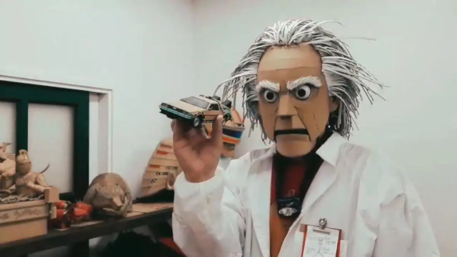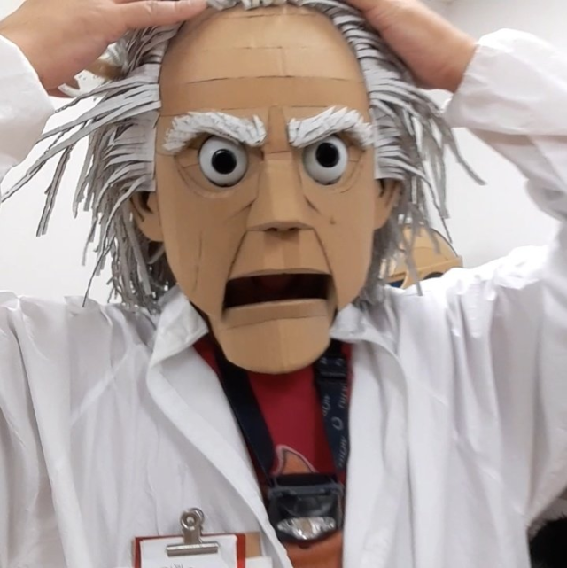 推主利用紙箱,白色紙板作出布朗博士的頭顱與頭髮,利用自己的技術將其製作出具有立體效果的模樣,以適切的大小讓其可以套在頭上,還原劇裡博士略待瘋狂的樣貌。