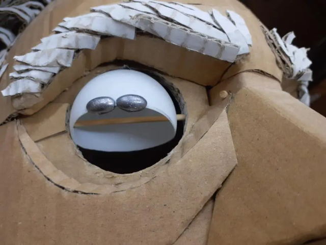 眼睛的部份,推主利用半剖的白色乒乓球製作,利用竹籤固定,展現出博士時常瞪大眼睛的經典樣貌。