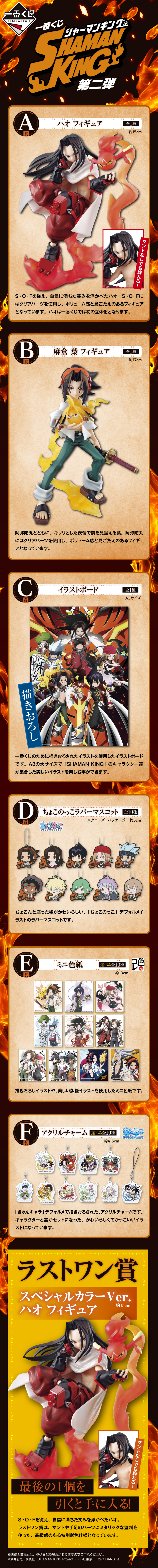 本次的「一番賞 通靈王 SHAMAN KING 第二彈」,共推出六種級別+最後賞、雙重中獎機會的獎品,分別為 A 賞麻倉葉王角色模型、B賞麻倉葉角色模型,另外還有C賞 插畫板、D賞 Q版角色模型、E賞 迷你色紙、F賞 壓克力吊飾和最後一賞 麻倉葉王 最後賞ver.角色模型,喜歡通靈王的玩具人不要錯過~