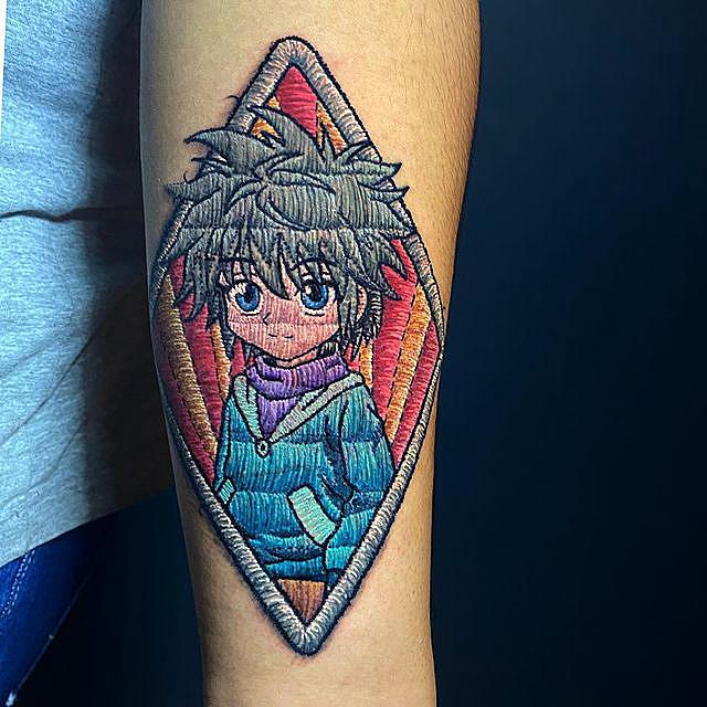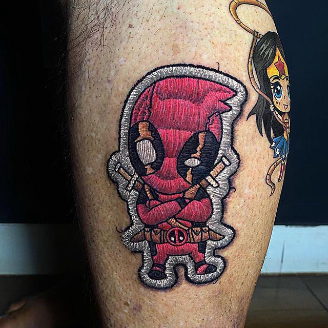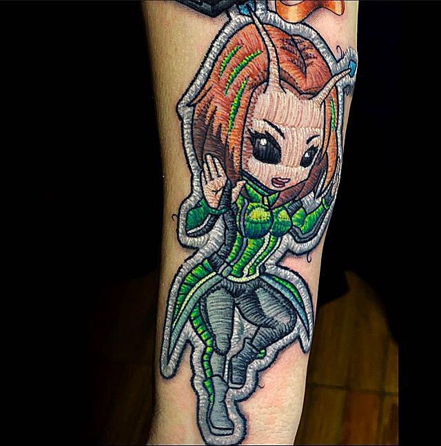 可以看到這些繪製在皮膚上作品,均是以熨斗貼的風格所呈現,更讓人感到欽佩的是,連同在熨斗貼上獨有的毛線紋路,也在這名刺青師的手中忠實呈現,乍看之下還真的極像了真實的刺繡臂章貼在皮膚上。