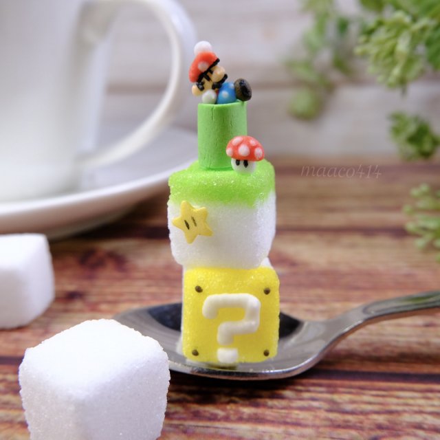 不僅是將兩塊方糖製作成黃色問號方塊與草地,還特別做出了超迷你瑪利歐與小小的綠色水管,使得整體上更加栩栩如生,這實在叫人捨不得吃進肚裡啊~