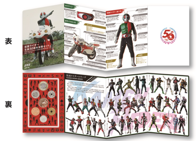紀念幣套組包括 7 種普通硬幣,500 元日幣到 1 元日幣都有,其中最矚目的就是屬於《假面騎士》的紀念幣「年銘板」 啦,騎上重機並刻上假面騎士字樣,背後有著 50 周年 logo。