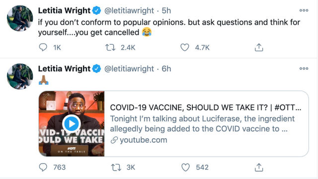 類似的「反疫苗」狀況,也發生在迪士尼旗下的漫威工作室,雖說在今年10月中旬時開始要求旗下工作團隊提出疫苗接種證明,並且佩帶腕帶來做為分組拍攝的依據。但早在去年時一度對外表態「反疫苗」立場的《黑豹》「舒莉」莉蒂西亞·萊特(Letitia Wright),因至今依舊抱持反對論點,因此外界也擔憂恐會對日後上映的《黑豹2》(Black Panther: Wakanda Forever)帶來影響。