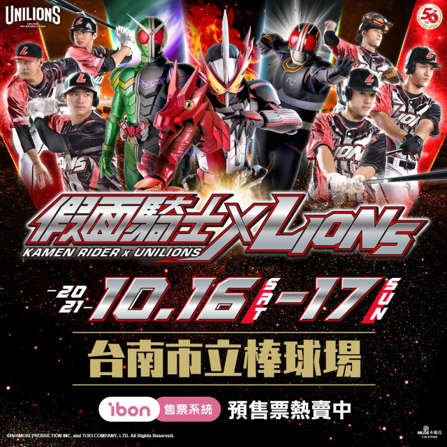 每年都與特攝作品合作主題日的中華職棒球隊-統一獅,於先前與《超人力霸王》與《假面騎士》合作後,今年再次與《假面騎士》合作,迎來 50 周年的假面騎士系列,這次將出動《假面騎士 W》、《假面騎士 BLACK》與《假面騎士聖刃》現場聲援統一獅啦 ! 主題日將於 2021 年 10 月 16 日& 17 日開幕,在府城的台南市立棒球場盛大舉行。